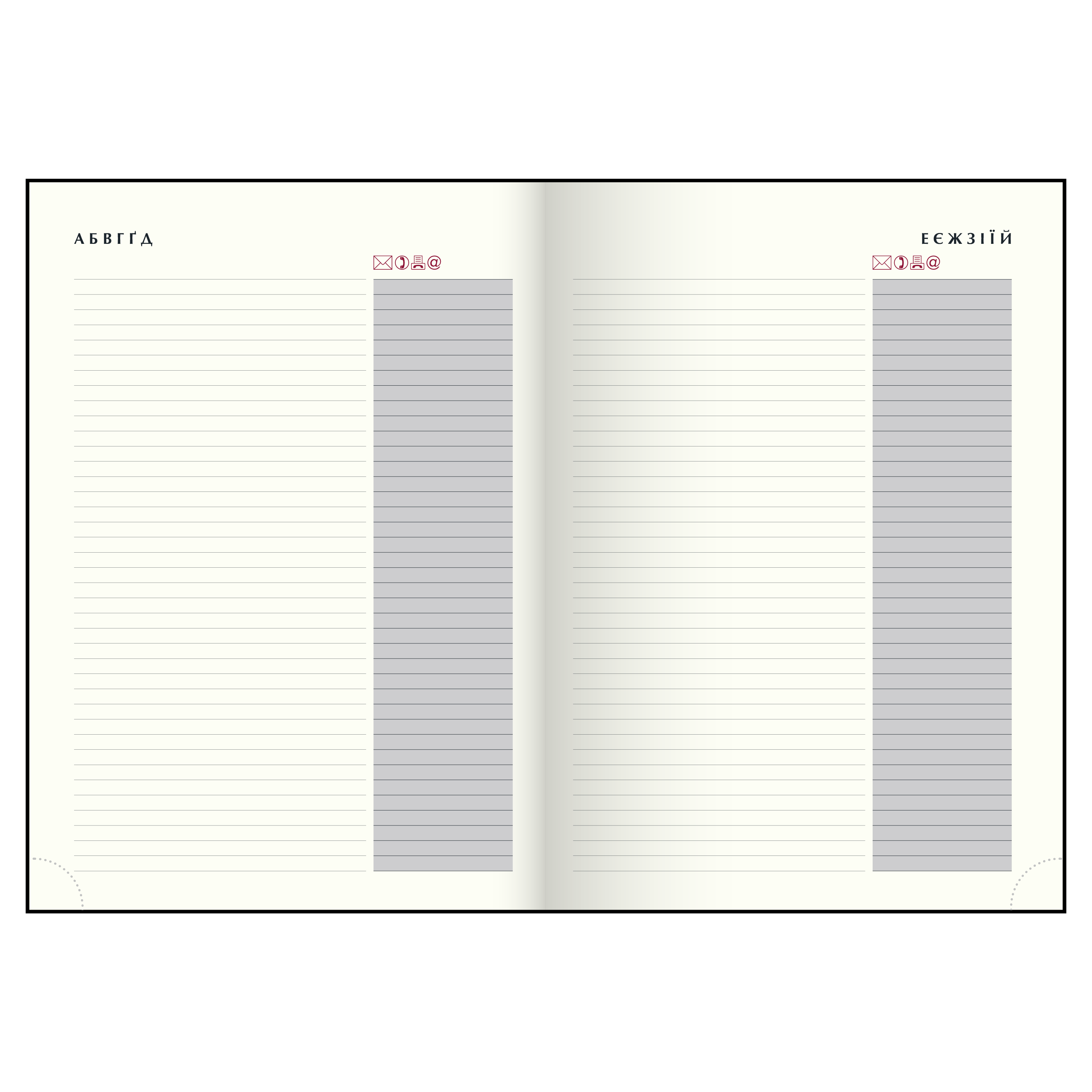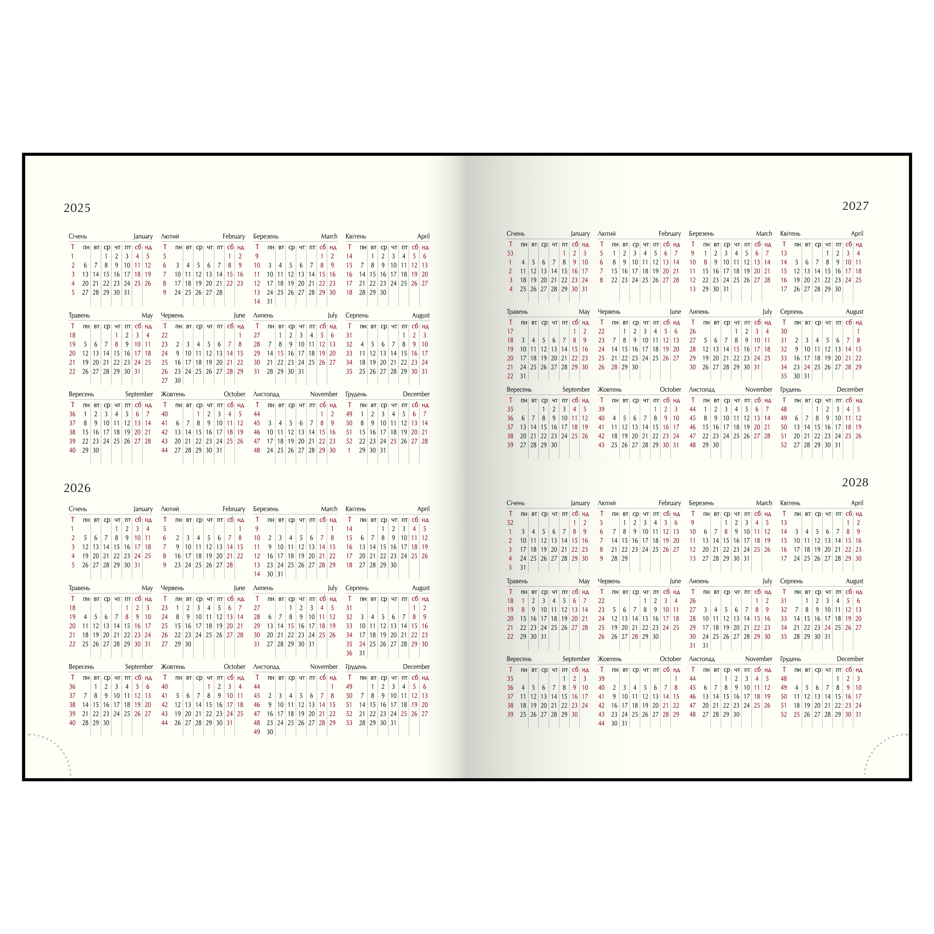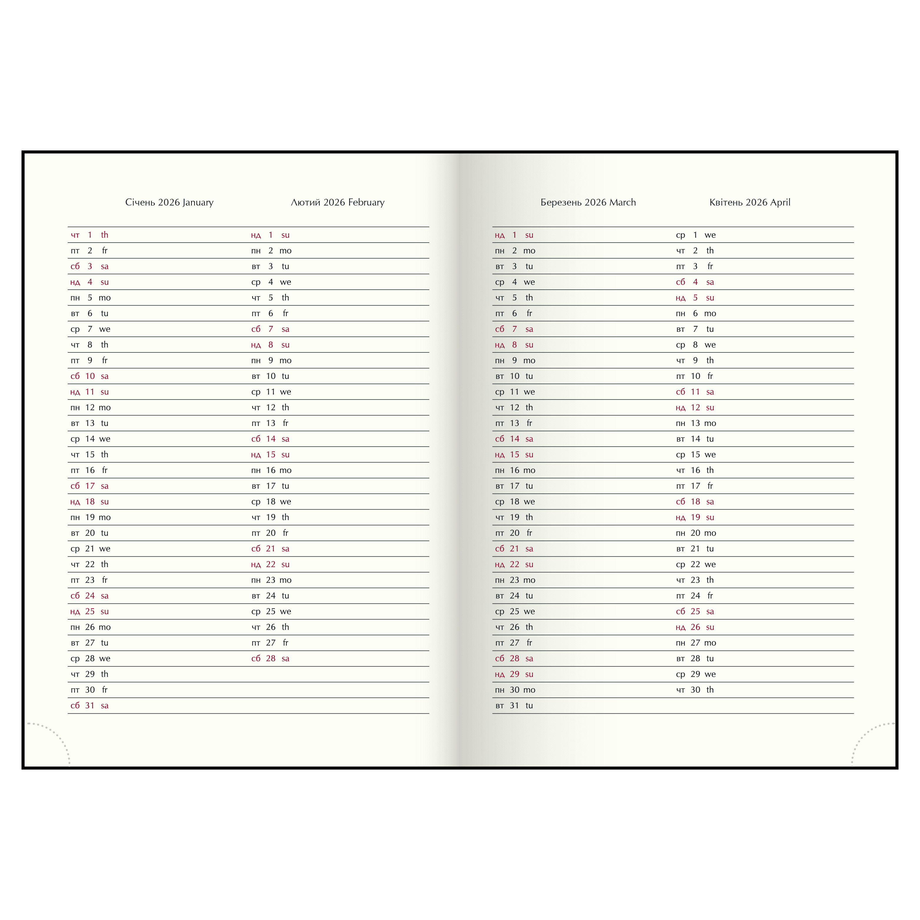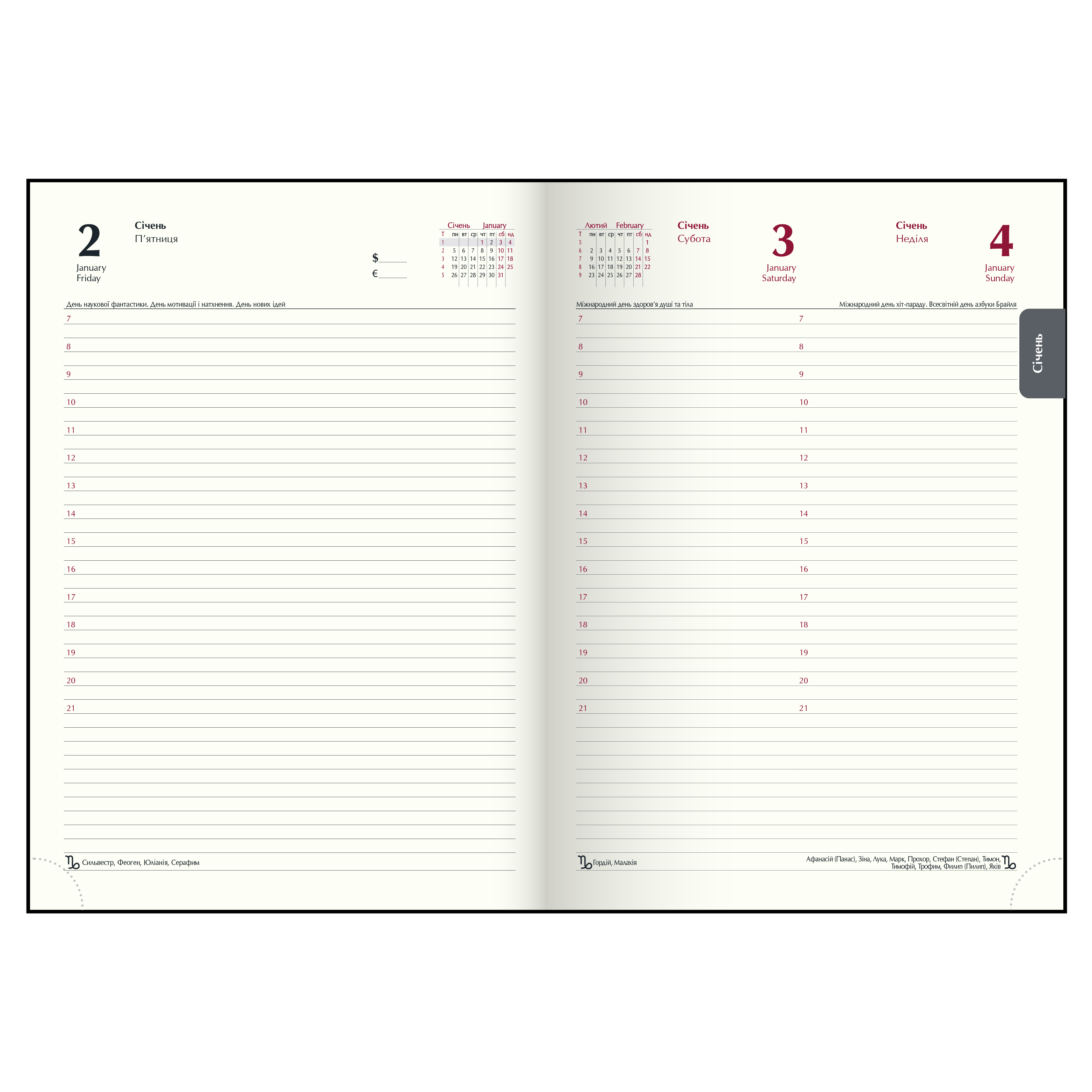 - Датована сторінка на кожен день року з організатором часу від 7:00 до 21:00, календарем на поточний/наступний місяць, позначенням дня тижня, знаку зодіаку, іменинників