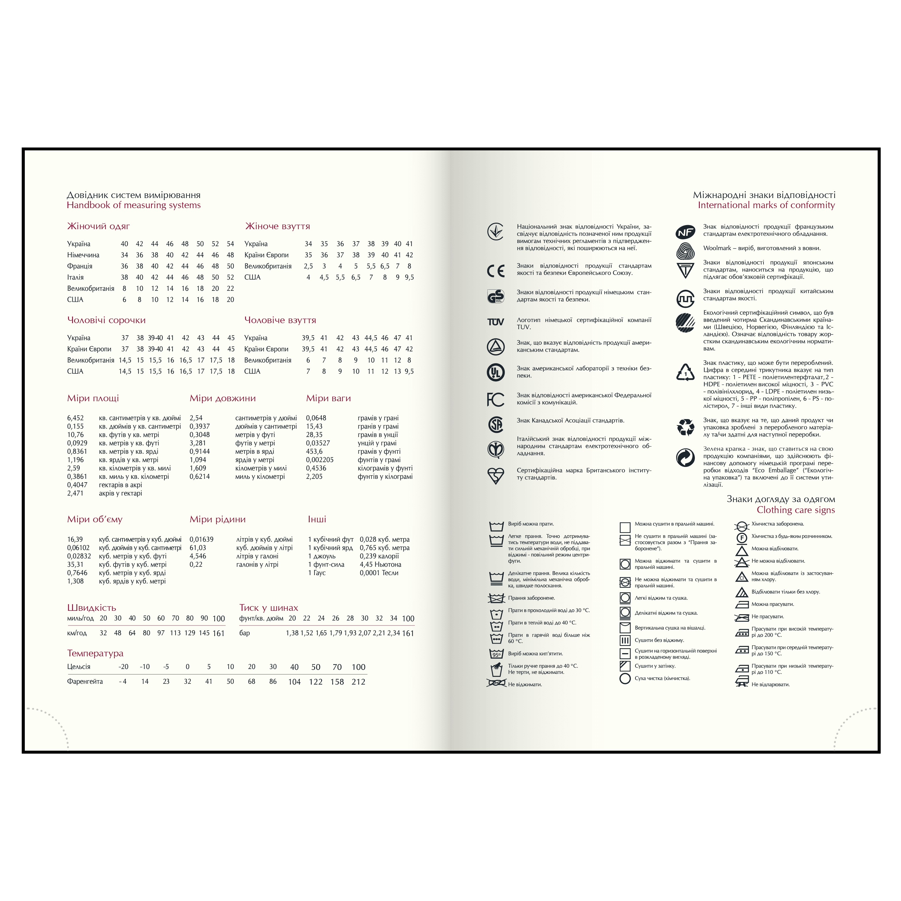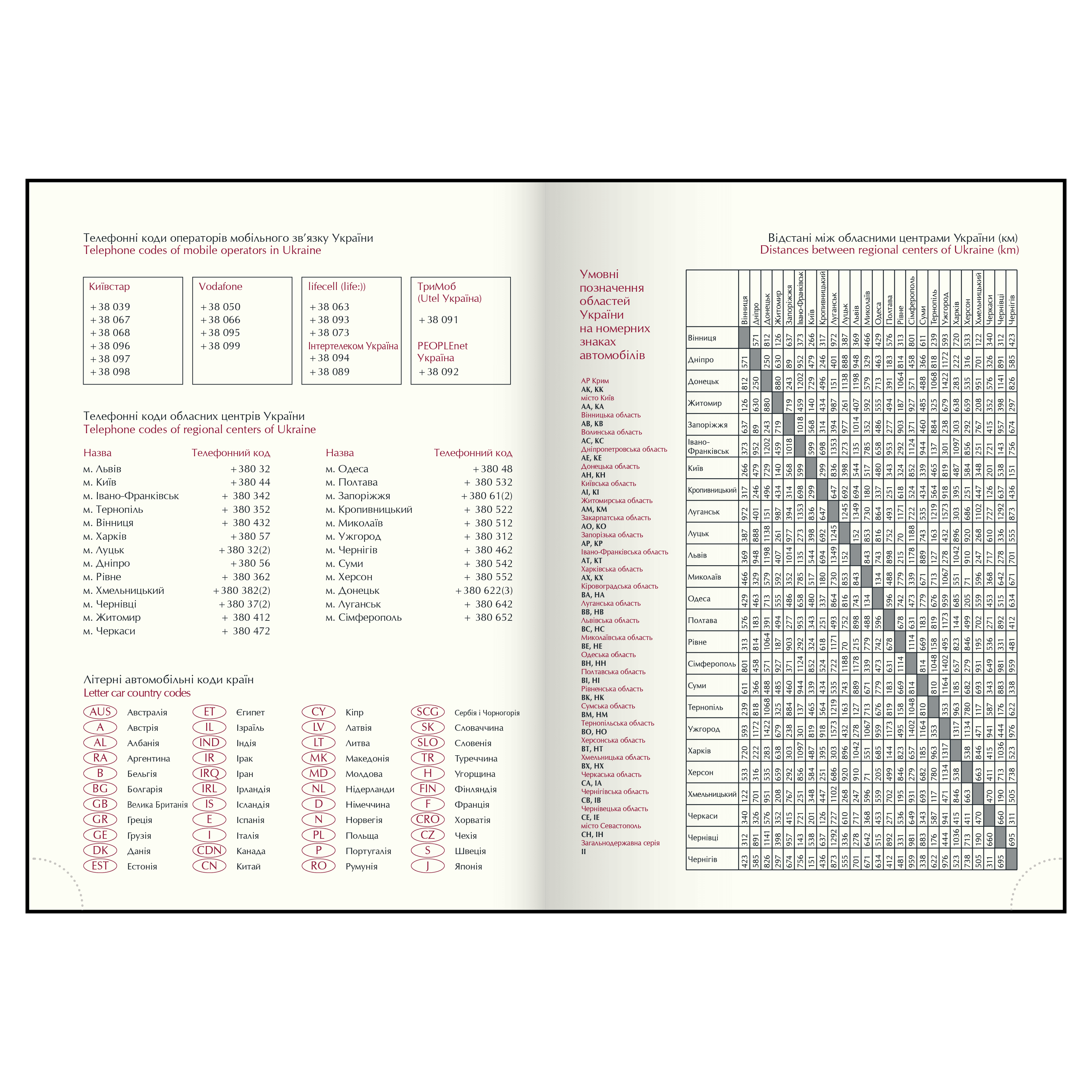 - Інформаційно-довідковий блок: національні, релігійні, професійні свята та пам'ятні дати, знаки зодіаку, телефонні коди мобільних операторів та обласних центрів України, літерні автомобільні коди країн, таблиця відстаней між обласними центрами України, довідник систем вимірювання, міжнародні знаки відповідності, знаки догляду за одягом