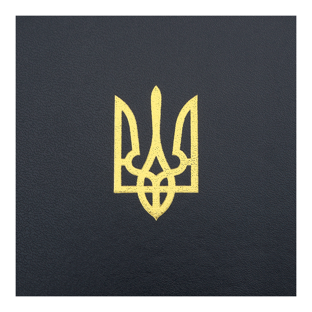 Жорстка обкладинка з бумвінілу з поролоном щоденника POWERFUL виконана у патріотичному мотивуючому дизайні з яскравими акцентами - тиснення Державного Герба та напису золотою фольгою. Гармонійно доповнює дизайн тонований золотом зріз внутрішнього блоку з нанесенням року.