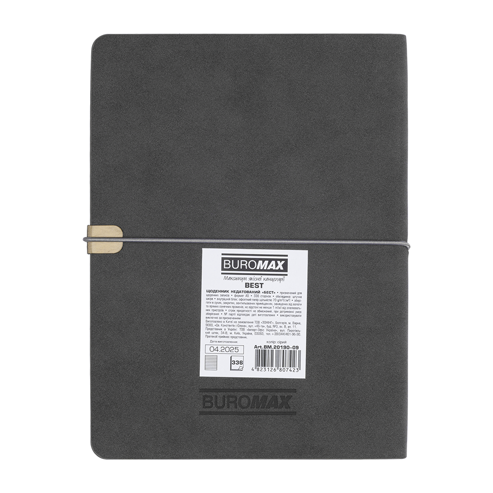Гнучка обкладинка щоденника BEST виконана з штучної шкіри з оксамитовою фактурою типу soft-touch. Поперечна кругла гумка акуратно лягає на металеві шильди на краю обкладинки та надійно фіксує щоденник в закритому положенні. Дизайн гармонійно доповнює тонування зрізу внутрішнього блоку в колір обкладинки.