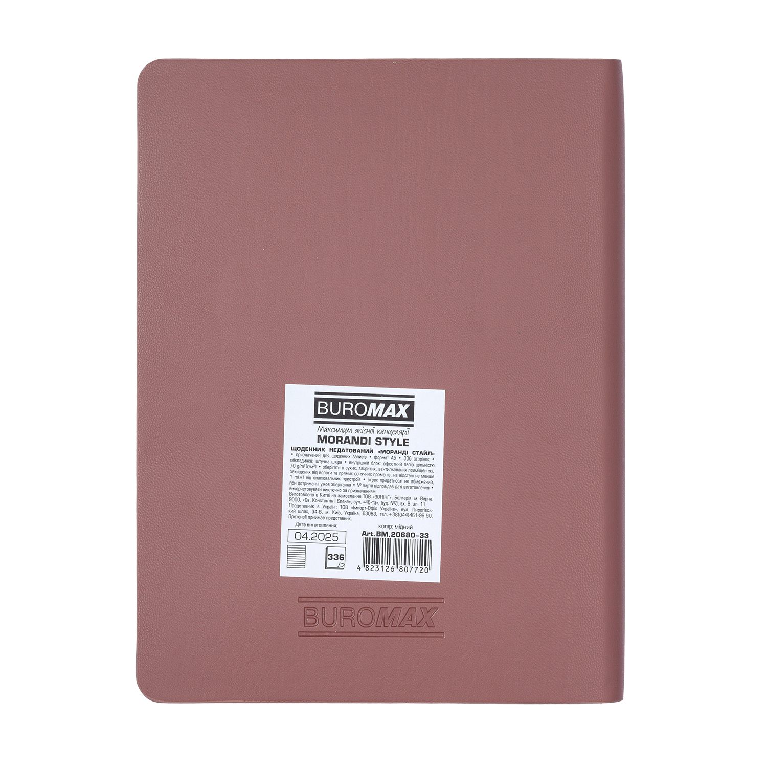 Гнучка обкладинка зі штучної шкіри щоденника MORANDI STYLE виконана під натуральну фактурну шкіру в кольорі популярної та привабливої палітри "моранді". Гармонійно доповнює дизайн тонований в колір обкладинки зріз внутрішнього блоку.
