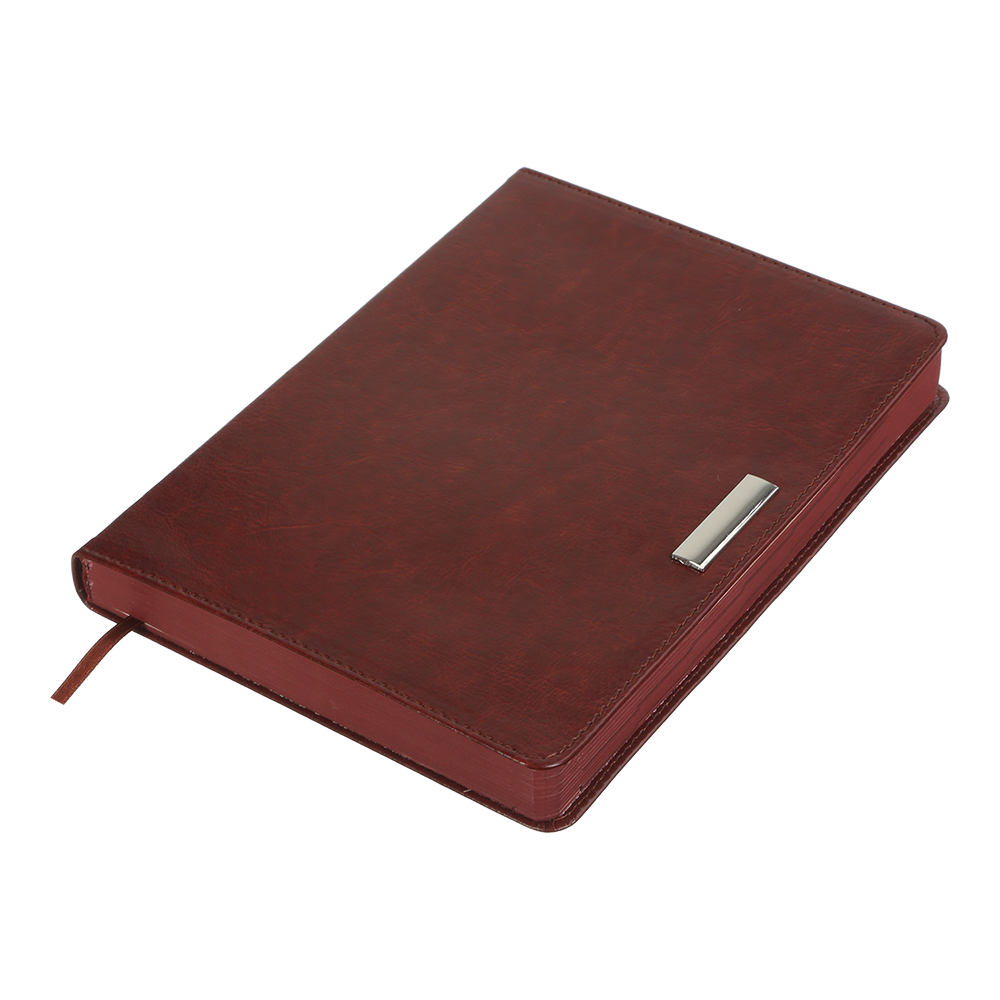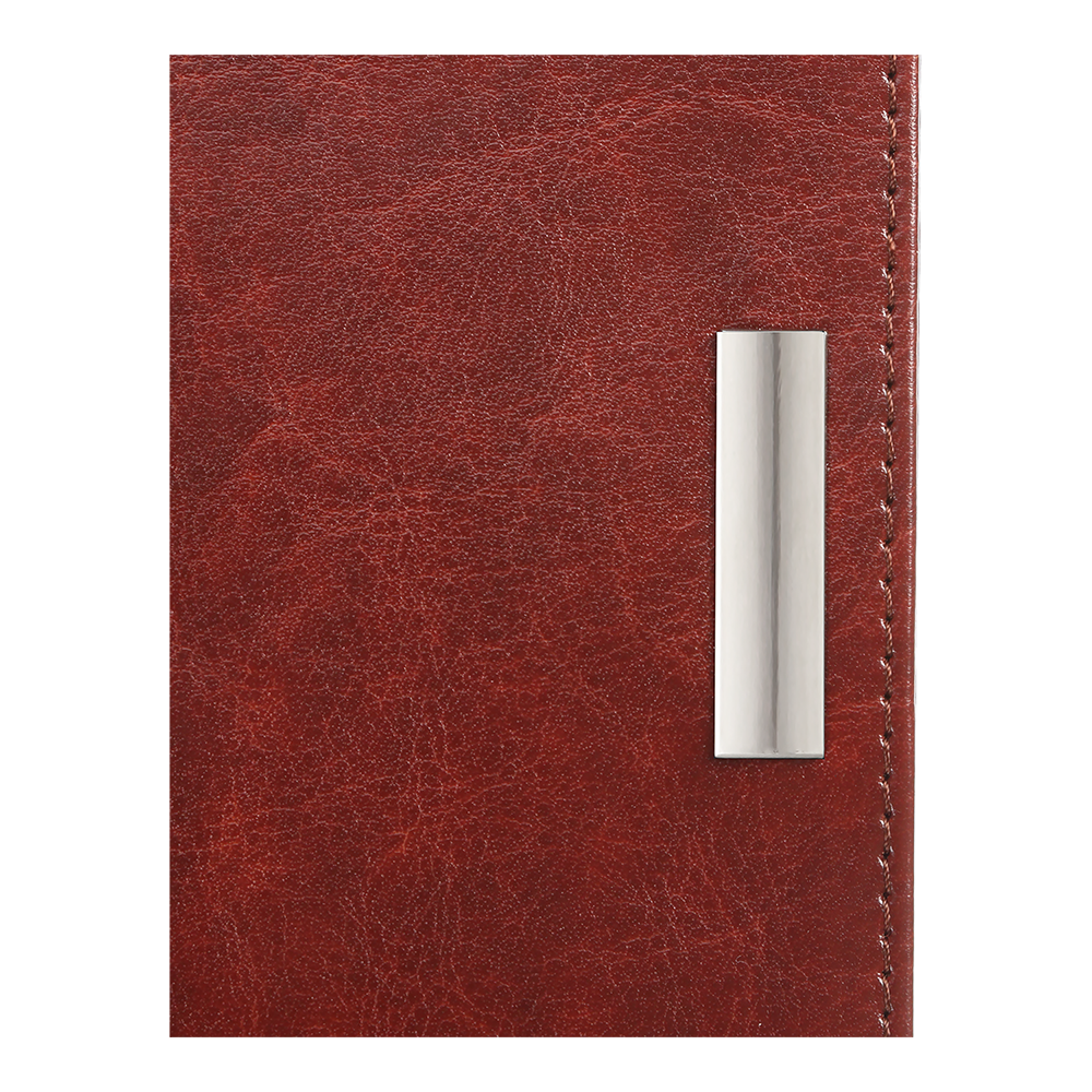 Гнучка обкладинка щоденника SALERNO виконана під натуральну шкіру. Унікальним елементом дизайну є металевий декор - шильда на лицьовій стороні обкладинки. Гармонійно доповнює дизайн тонований зріз внутрішнього блоку в колір обкладинки та декоративний шов по периметру.