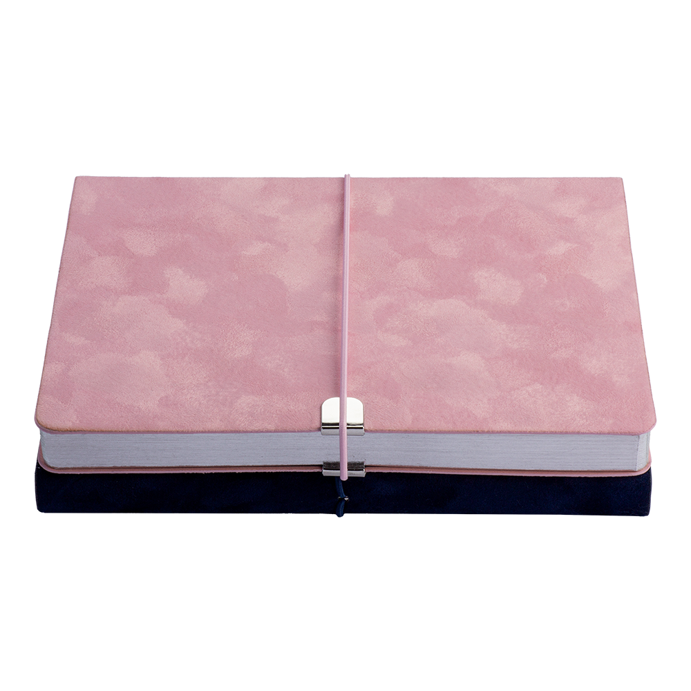 Гнучка обкладинка щоденника VELOUR виконана з штучної шкіри з виразним оксамитовим покриттям. Дві функціональні шильди на лицьовій та зворотній стороні обкладинки з поглибленнями та поперечна гумка, що акуратно лягає на них, забезпечують надійну фіксацію щоденника в закритому стані. Дизайн гармонійно доповнює та збагачує тонований срібним кольором зріз внутрішнього блоку та тиснення срібною фольгою напису на лицьовій стороні обкладинки.
