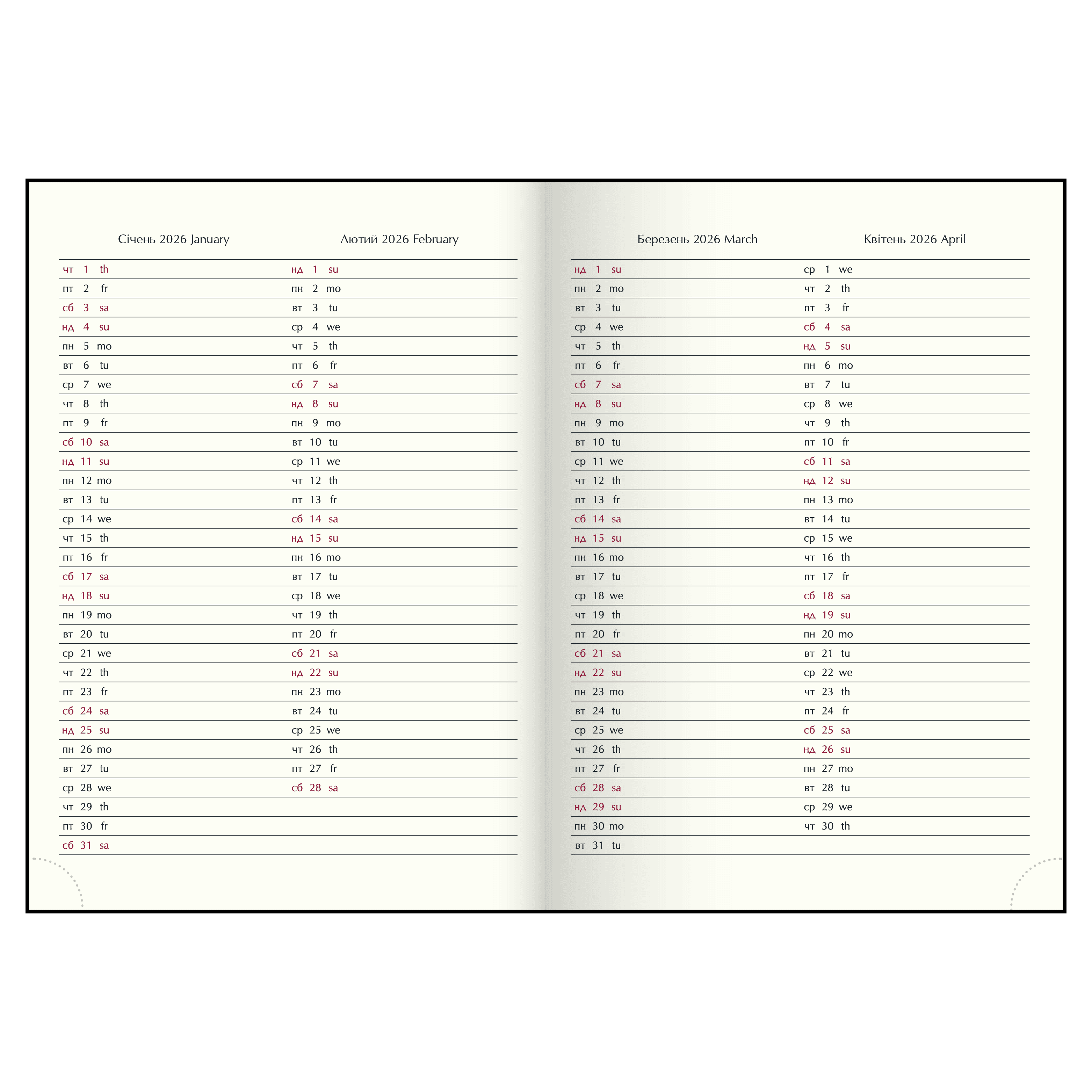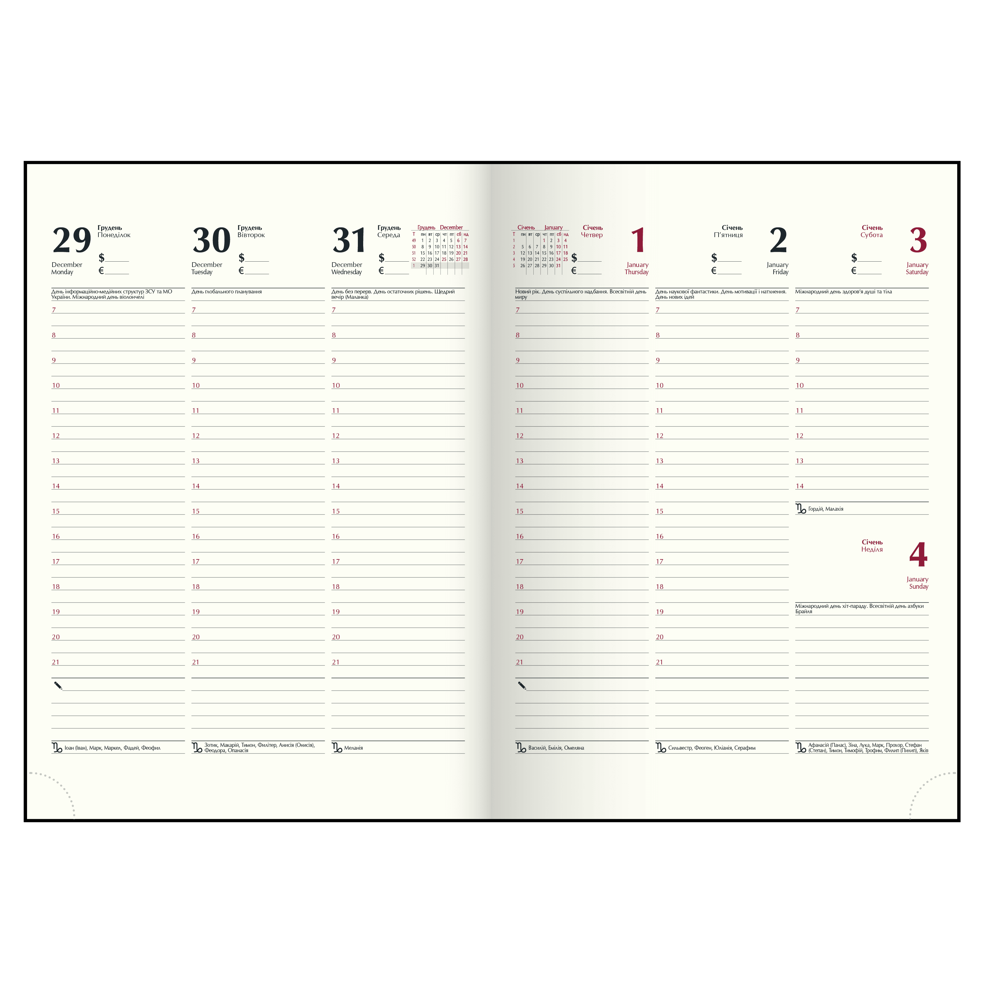 - На одній сторінці вертикально розміщено три/чотири дні тижня (субота і неділя - вертикальне розташування на одній частині), з організатором часу від 7:00 до 21:00, вказівкою місяця, року, дня тижня та дати, календар на поточний/наступний місяць, іменинники, знаки зодіаку, свята та пам'ятні дати
