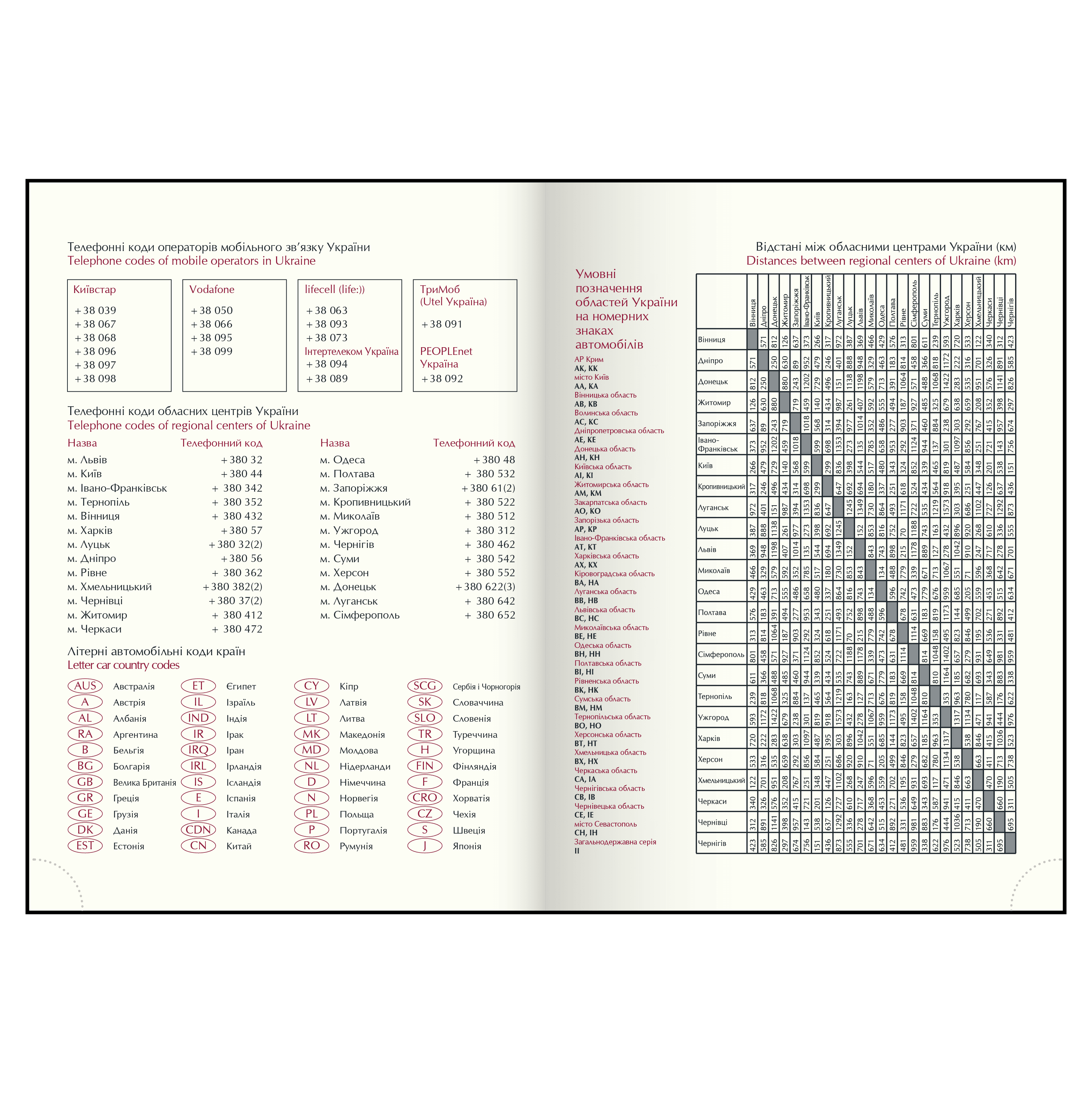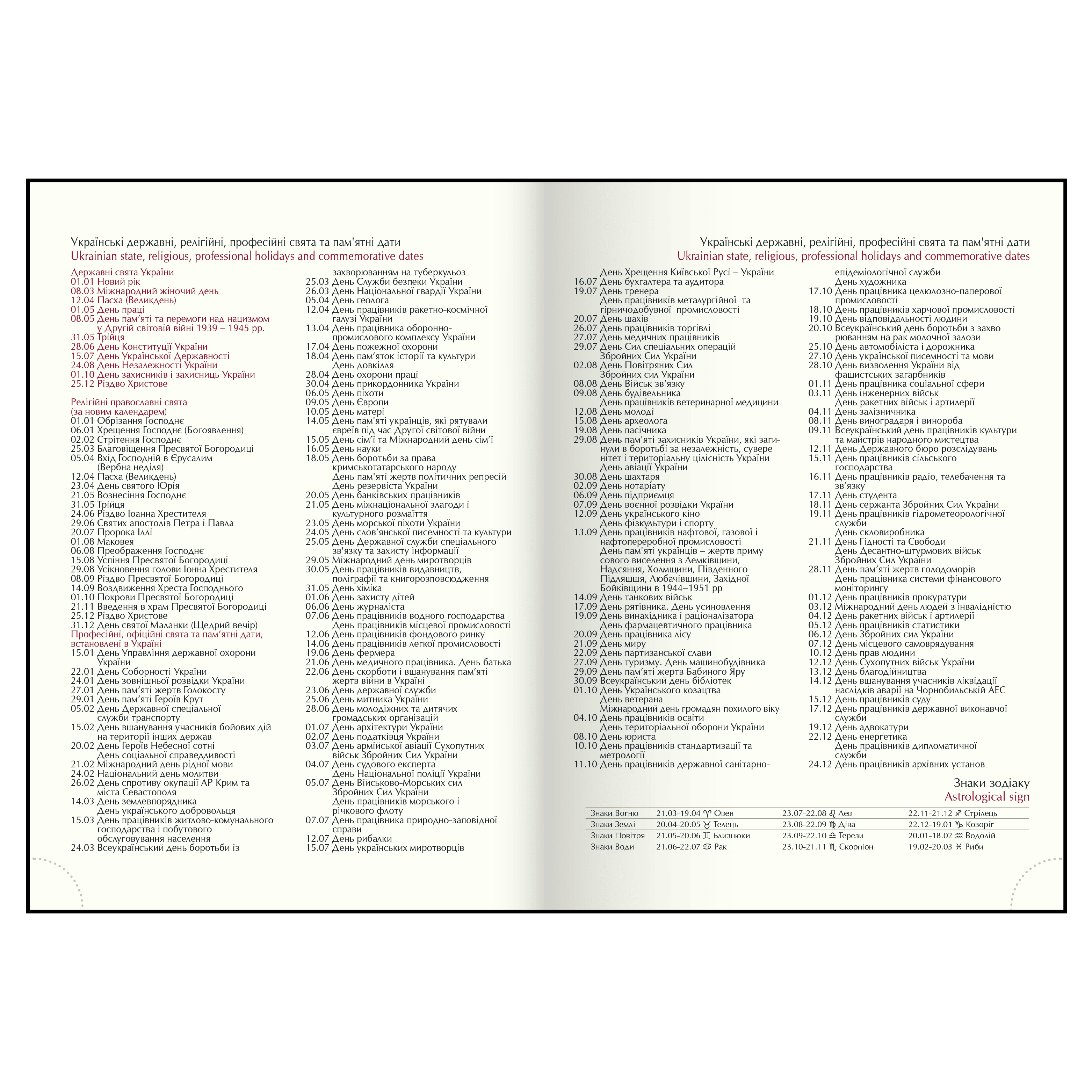 - Інформаційно-довідковий блок: національні, релігійні, професійні свята та пам'ятні дати, знаки зодіаку, телефонні коди мобільних операторів та обласних центрів України, літерні автомобільні коди країн, таблиця відстаней між обласними центрами України, довідник систем вимірювання, міжнародні знаки відповідності, знаки догляду за одягом