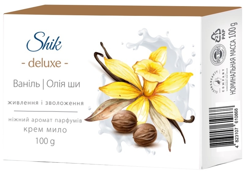 Крем-мило Shik De Luxe Ваніль та олія ши — це якісне косметичне мило для щоденного догляду за шкірою рук і тіла, яке поєднує у собі натуральні компоненти, ніжне очищення та приємний аромат. Завдяки косметичному крему та екстрактам оливкової олії і алое вера мило дбайливо очищує шкіру, не пересушує її, освіжає та підтримує відчуття м’якості, гладкості та шовковистості. Насичена формула з гідрозілатом протеїнів шовку глибоко зволожує шкіру, робить її пружною та шовковистою. Ніжні пахощі мило дарують приємне відчуття свіжості та комфорту. Дія: Дбайливе очищення шкіри рук і тіла, Освіження та підтримка пружності шкіри, Глибоке зволоження і пом’якшення, Надання шкірі гладкості та шовковистості, Створення приємного аромату.