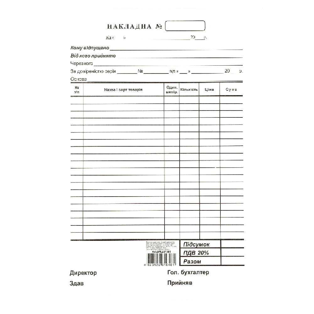 Видаткова накладна для обліку операцій з товаром.Формат А5100 бланків у блоціВиготовлена на офсетному папері щільністю 60 г/м²Блок проклеєний по короткій стороні Односторонній друк в один колір