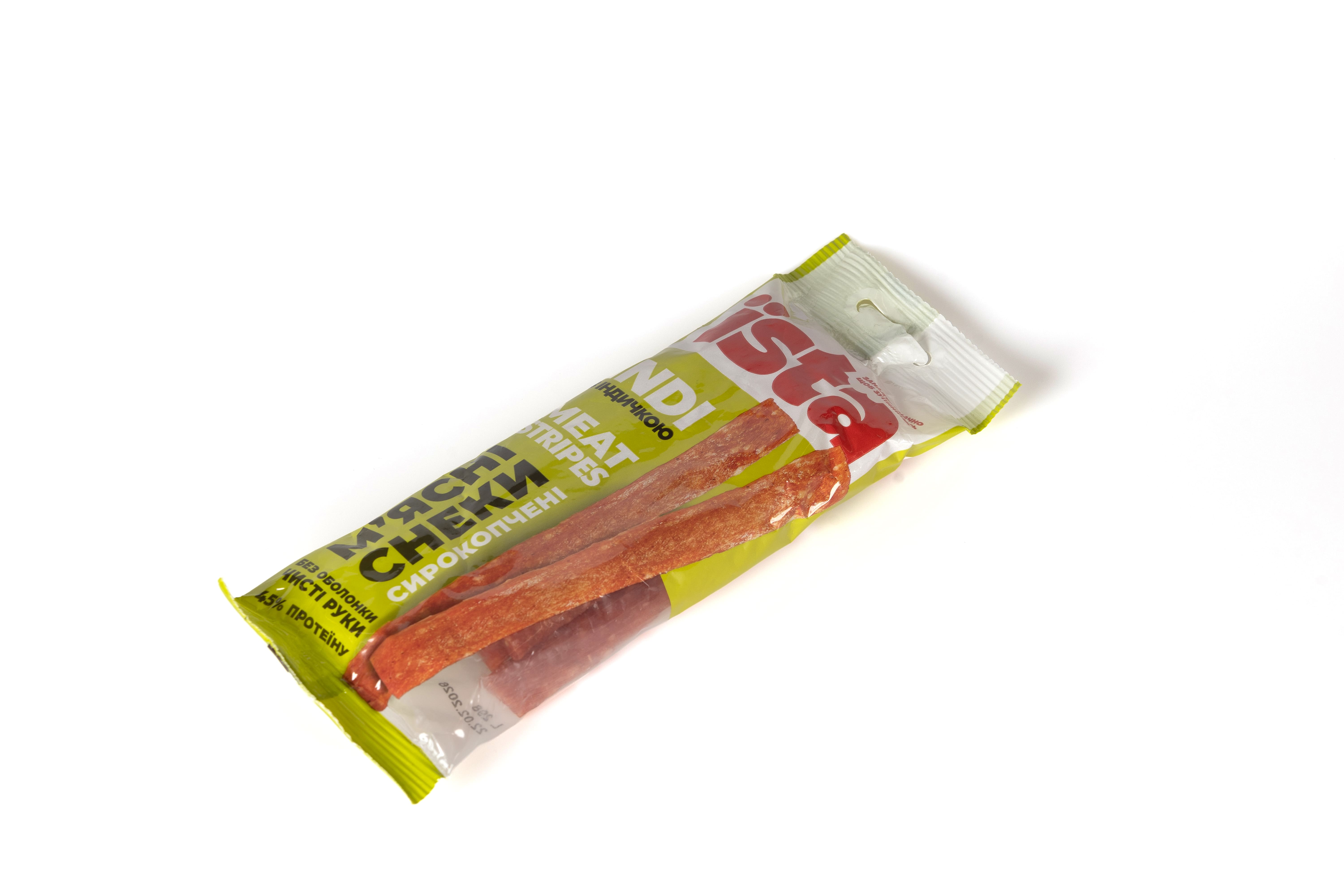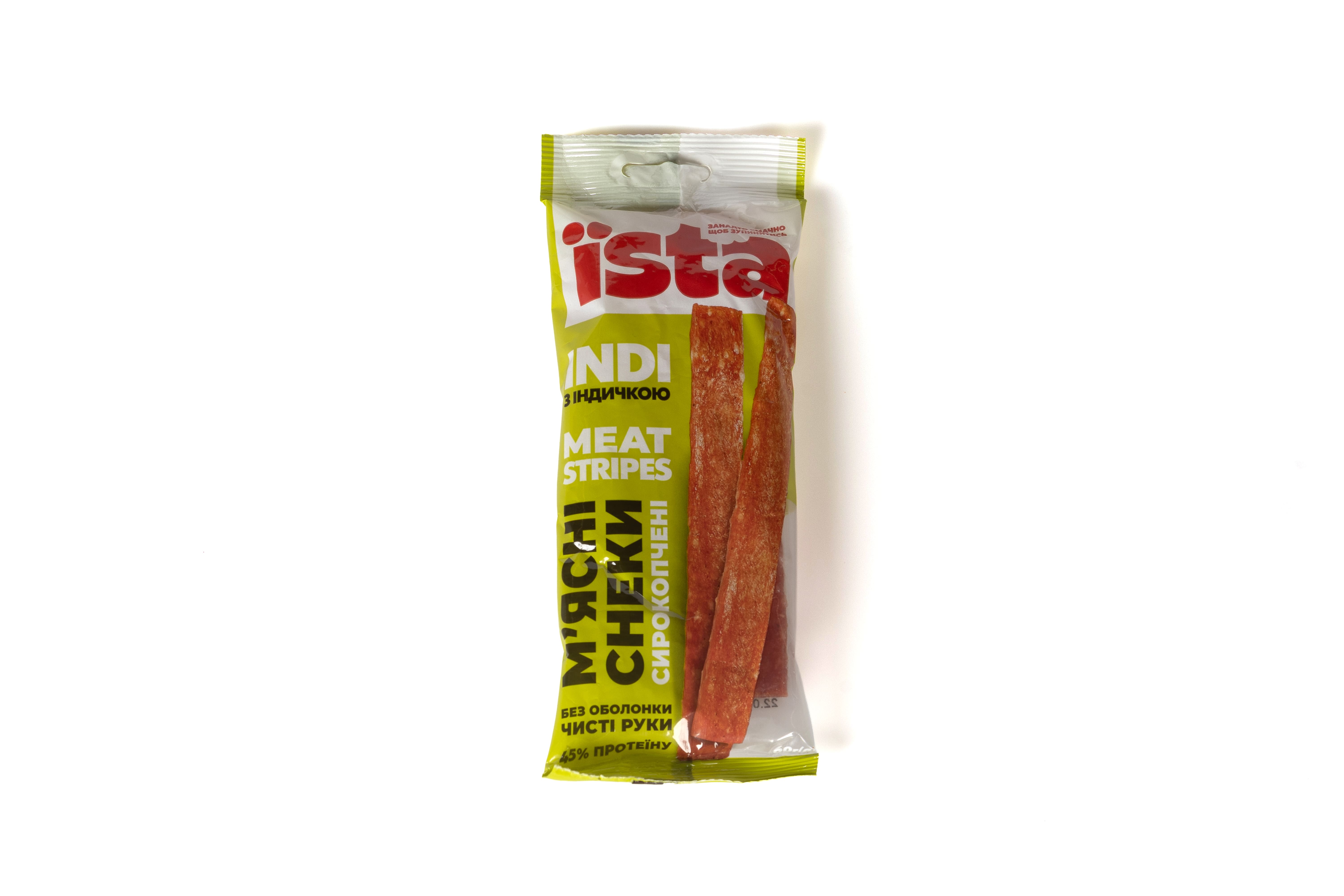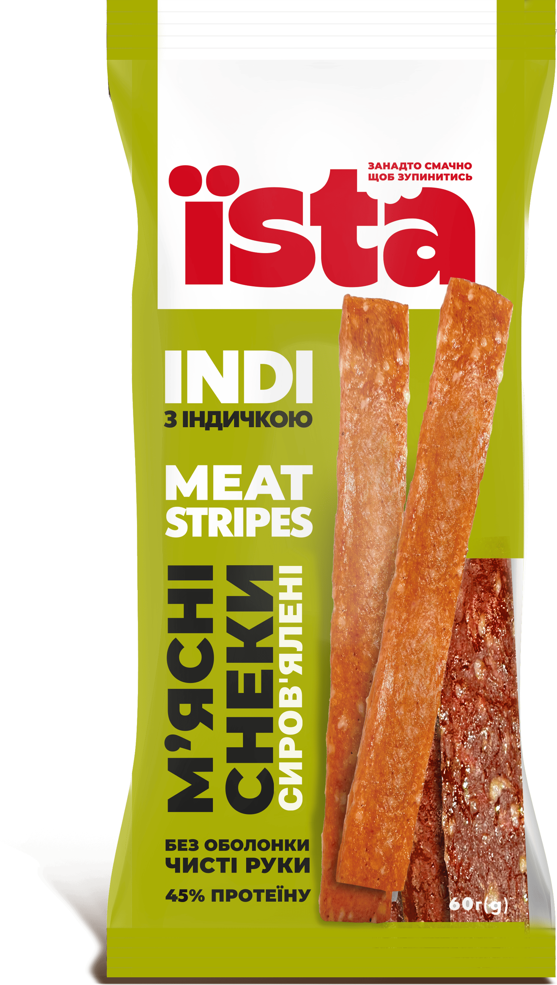arrow_back_ios Снеки м’ясні сирокопчені, 60г, Meat Stripes INDI, ЇSTA