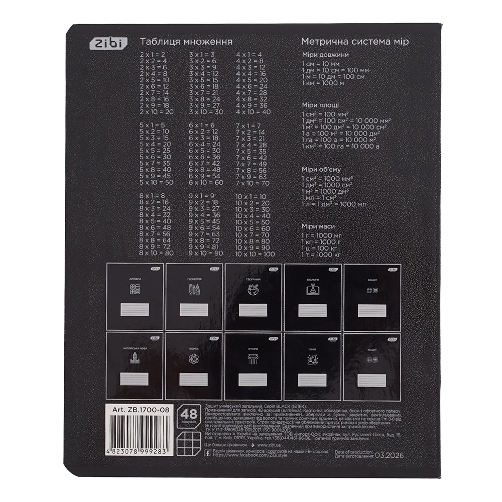 Зошит учнівський загальний серії "BLACK" з геометрії від ZiBi з креативним сучасним дизайном обкладинки та блоком корисної довідкової інформації чудово підходить для виконання класних та домашніх робіт.