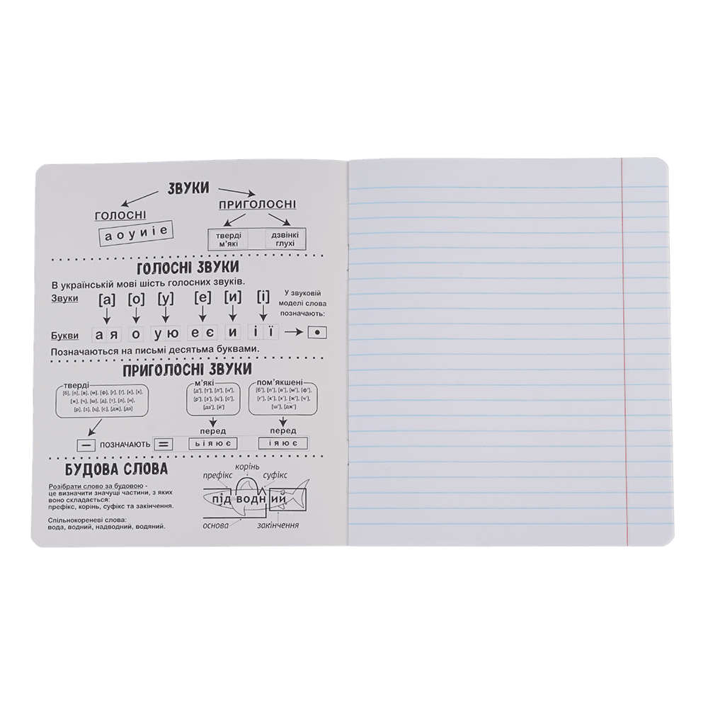 - Зошит в лінію, друк блакитним кольором, має червоні поля