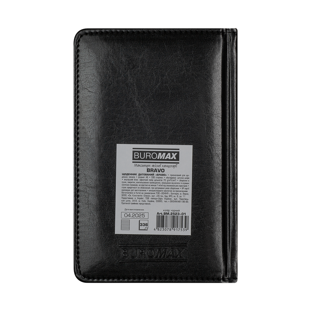 Жорстка обкладинка щоденника BRAVO виготовлена з гладкої штучної шкіри, з поролоном у класичному дизайні. На лицьовій стороні - тиснення року сліпим методом. Тонування зрізу золотом додає вишуканий акцент.