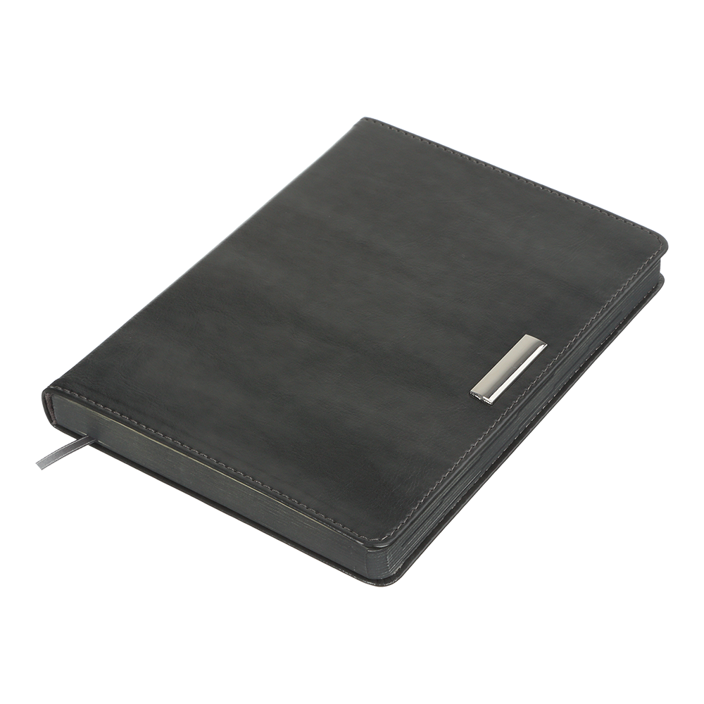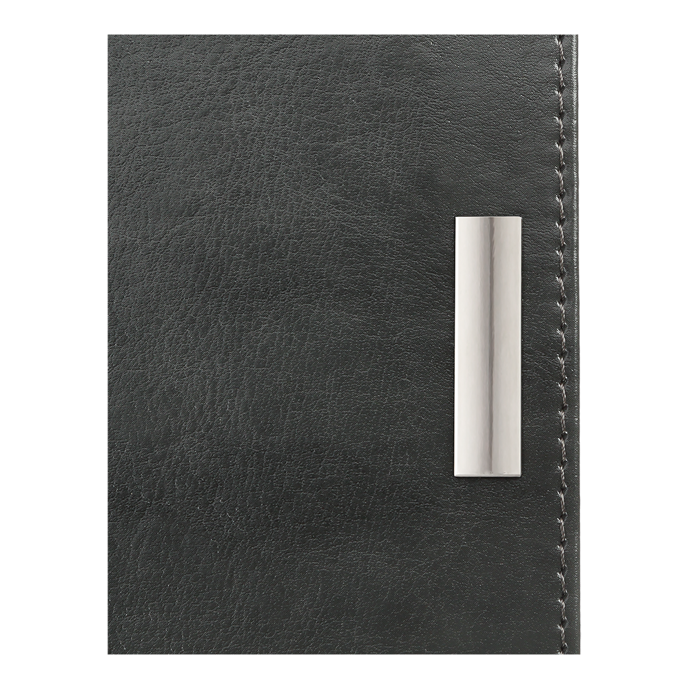 Гнучка обкладинка щотижневика SALERNO виконана з гладкої штучної шкіри. Унікальним елементом дизайну є металевий декор - шильда на лицьовій стороні обкладинки. Гармонійно доповнює дизайн сліпе тиснення року на корінці, тонований в колір обкладинки зріз внутрішнього блоку.