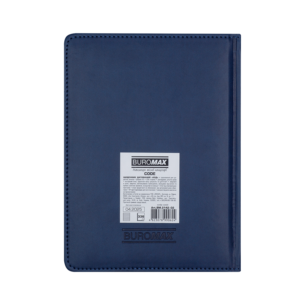 Жорстка обкладинка щоденника CODE виконана в строгому діловому стилі зі штучної шкіри, з поролоном. Елементи оздоблення - сліпе тиснення року та елементу, що нагадує штриховий код, а також декоративний шов по периметру обкладинки. Гармонійно доповнює дизайн тонований в колір обкладинки зріз внутрішнього блоку.