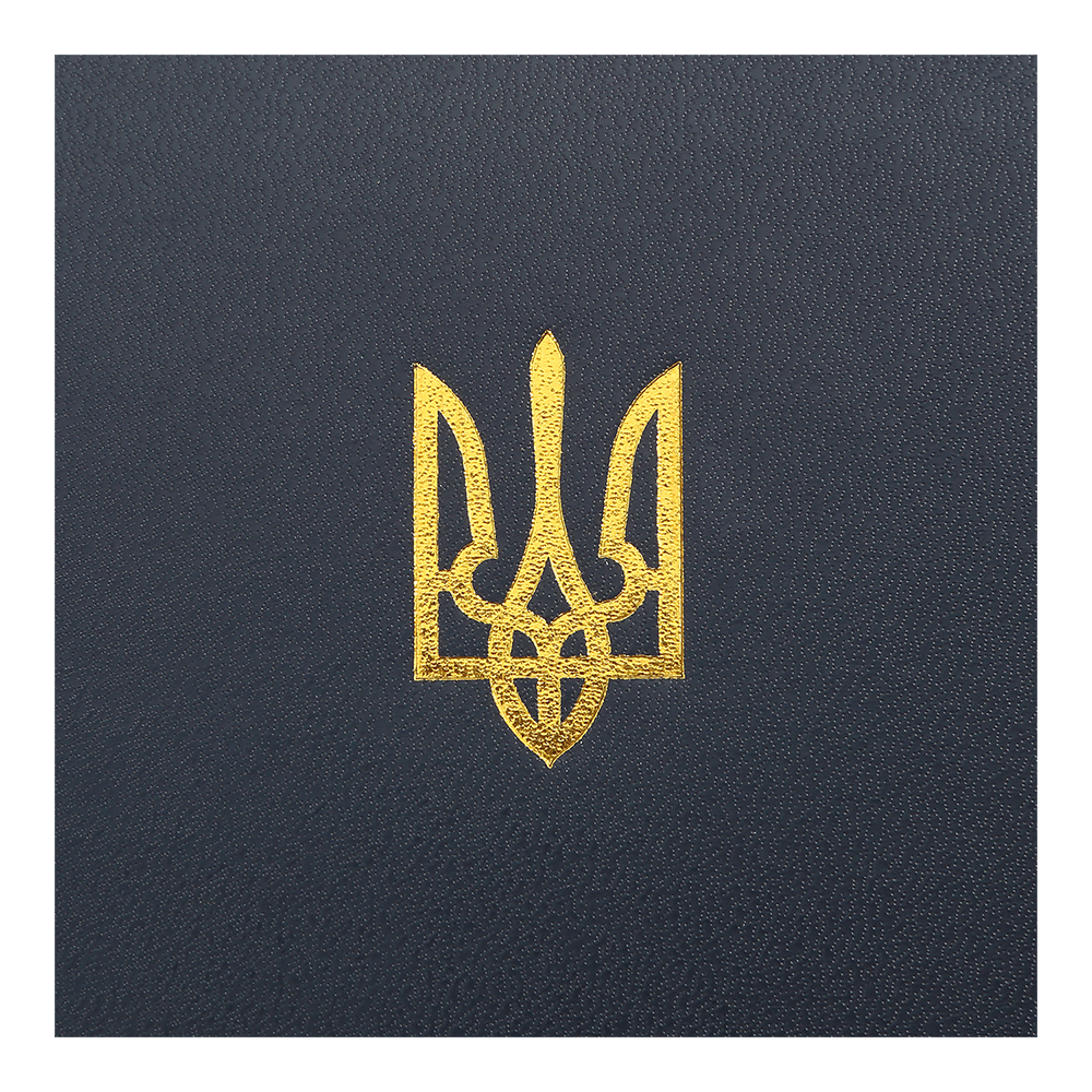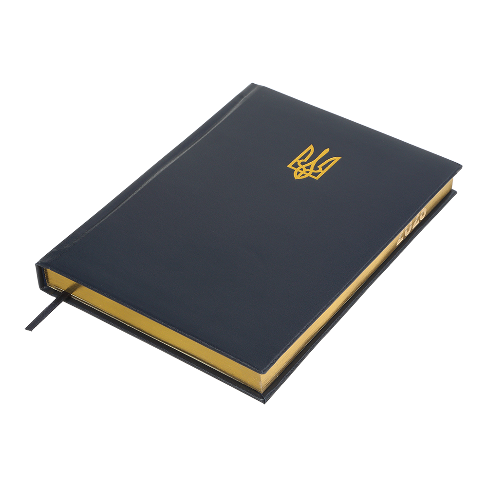 Жорстка обкладинка з бумвінілу з поролоном щоденника POWERFUL виконана у патріотичному мотивуючому дизайні з яскравими акцентами - тиснення Державного Герба та напису золотою фольгою. Гармонійно доповнює дизайн тонований золотом зріз внутрішнього блоку з нанесенням року.