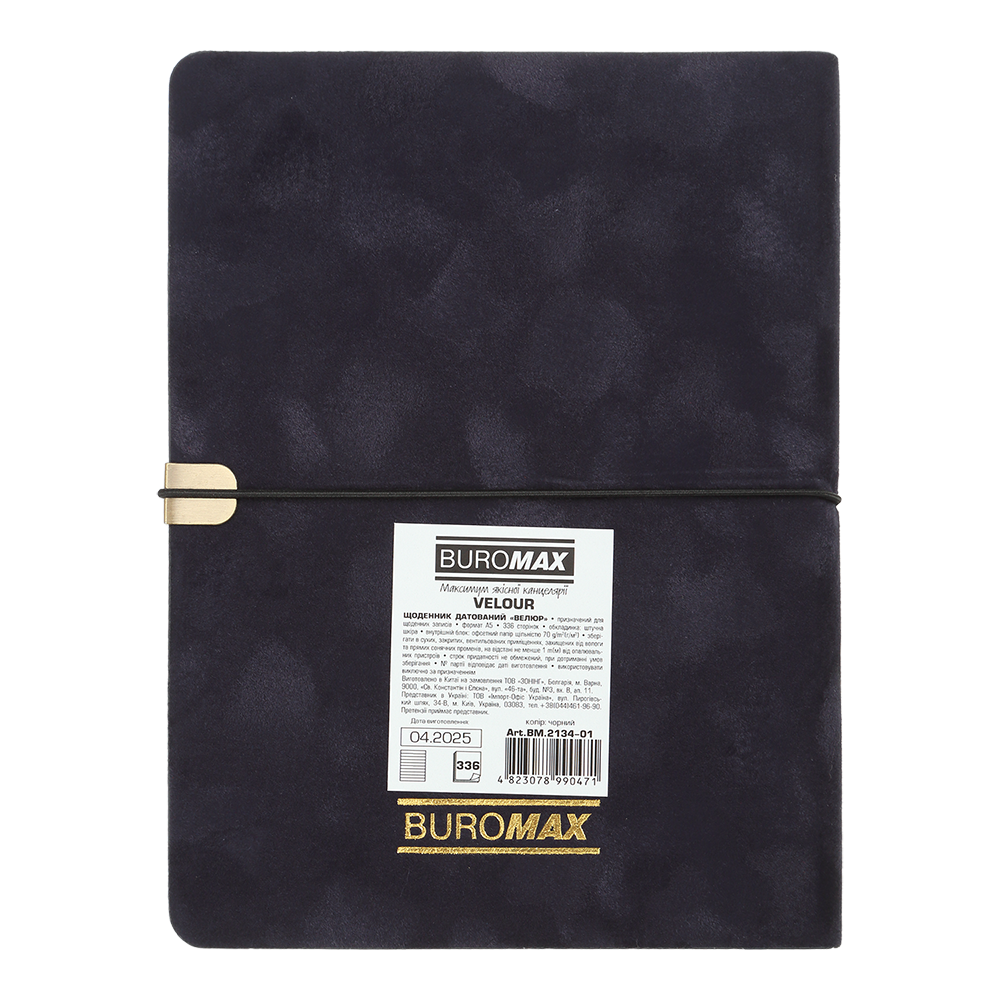 Гнучка обкладинка щоденника VELOUR виконана з штучної шкіри з виразним оксамитовим покриттям. Дві функціональні шильди на лицьовій та зворотній стороні обкладинки з поглибленнями для поперечної гумки забезпечують зручну та надійну фіксацію щоденника в закритому стані. Дизайн гармонійно доповнює та збагачує тонований золотим кольором зріз внутрішнього блоку та тиснення золотою фольгою року і напису на лицьовій стороні обкладинки.
