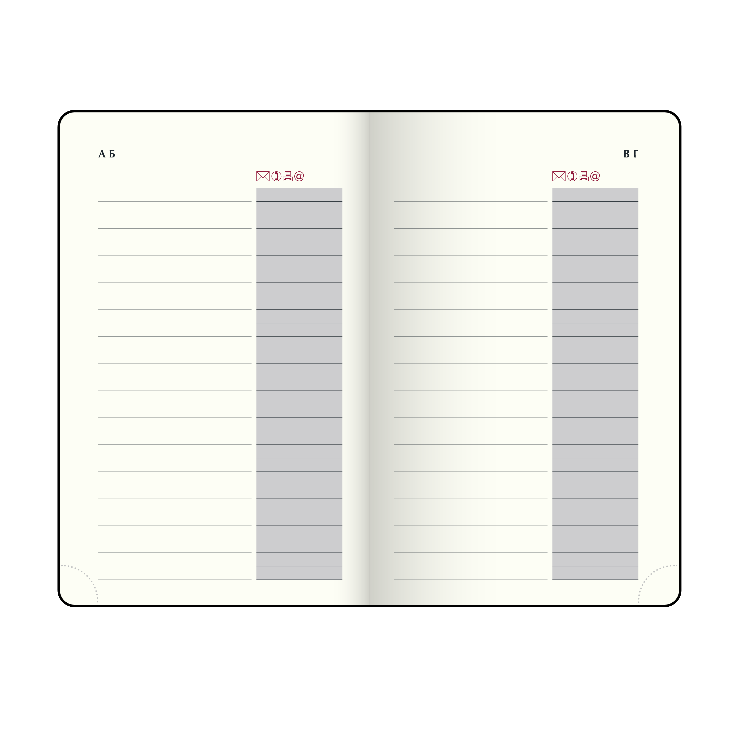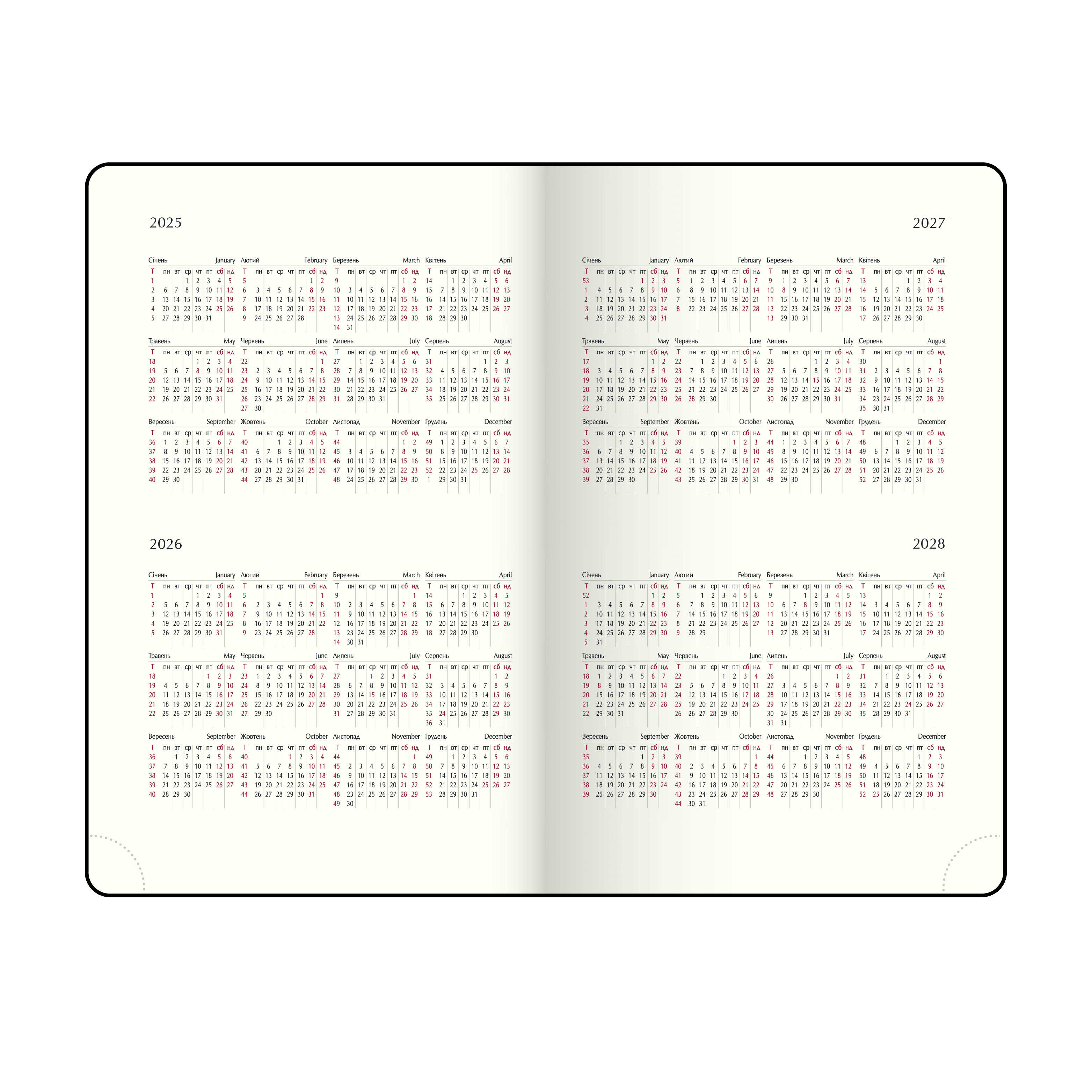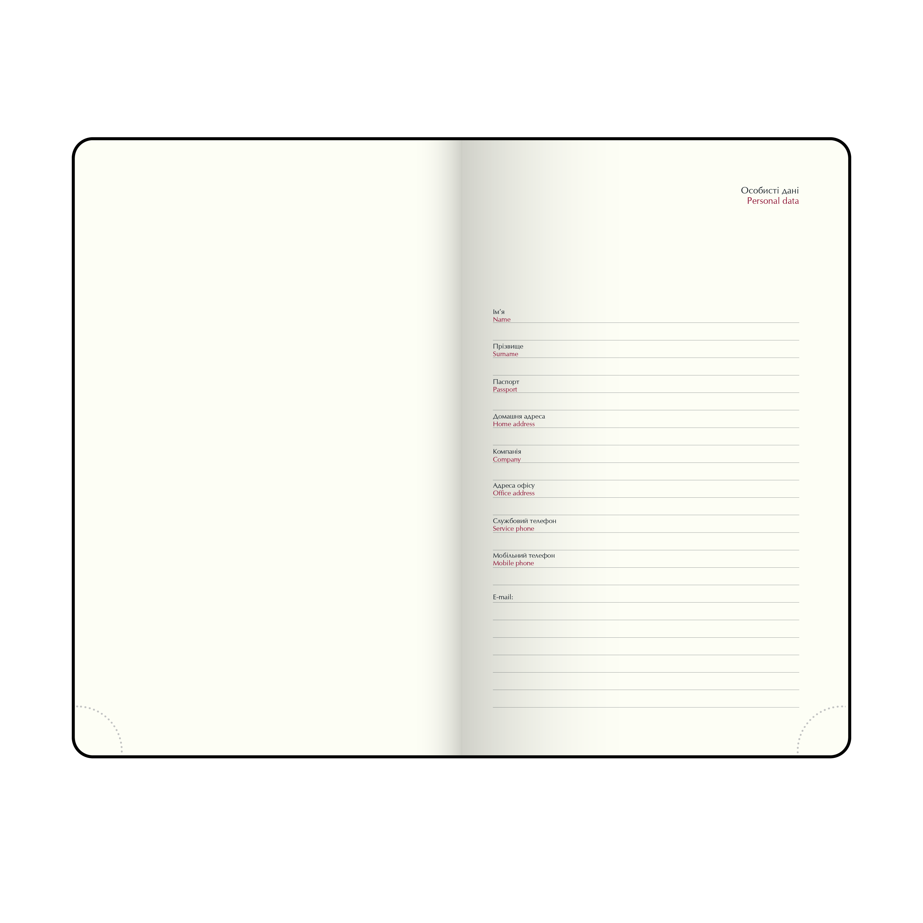 Гнучка обкладинка щотижневика VELOUR виконана з штучної шкіри з виразним оксамитовим покриттям. Дві функціональні шильди на лицьовій та зворотній стороні обкладинки з поглибленнями для поперечної гумки забезпечують зручну та надійну фіксацію щоденника в закритому стані. Дизайн гармонійно доповнює та збагачує тонований срібним кольором зріз внутрішнього блоку та тиснення срібною фольгою року і напису на лицьовій стороні обкладинки.