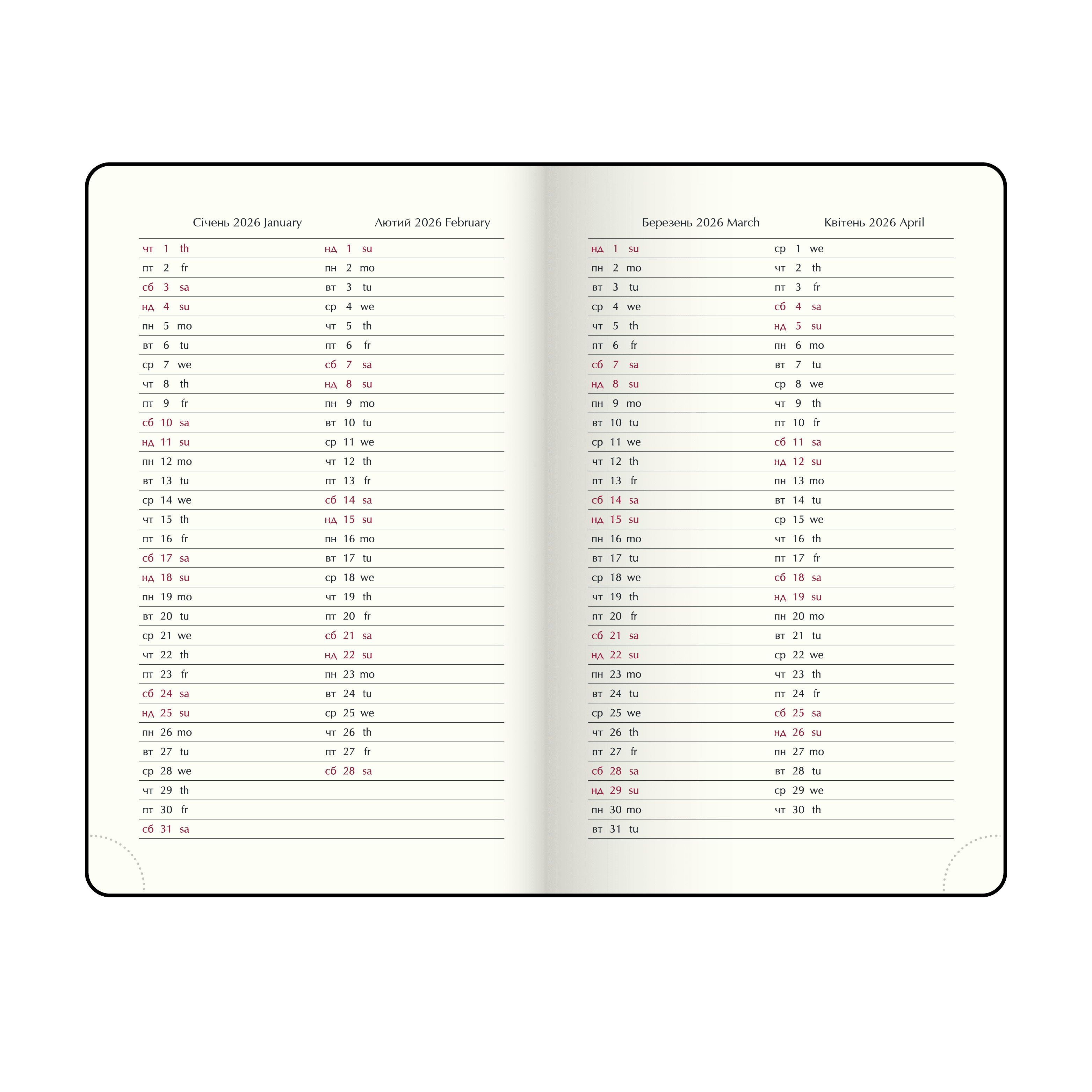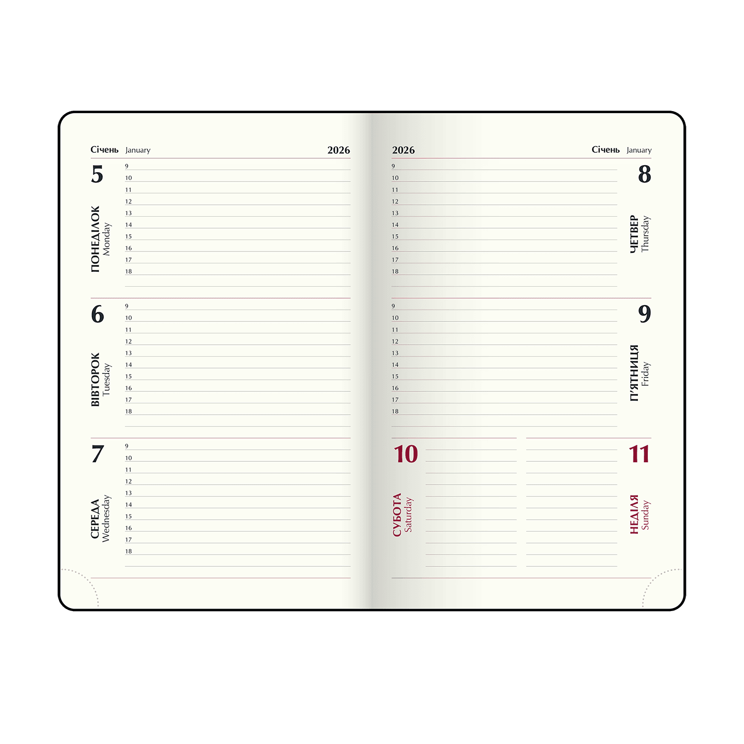 - На одній сторінці горизонтально розміщено три/чотири дні тижня (субота і неділя - вертикальне розташування на одній частині), з організатором часу від 9:00 до 18:00, вказівкою місяця, року, дня тижня та дати