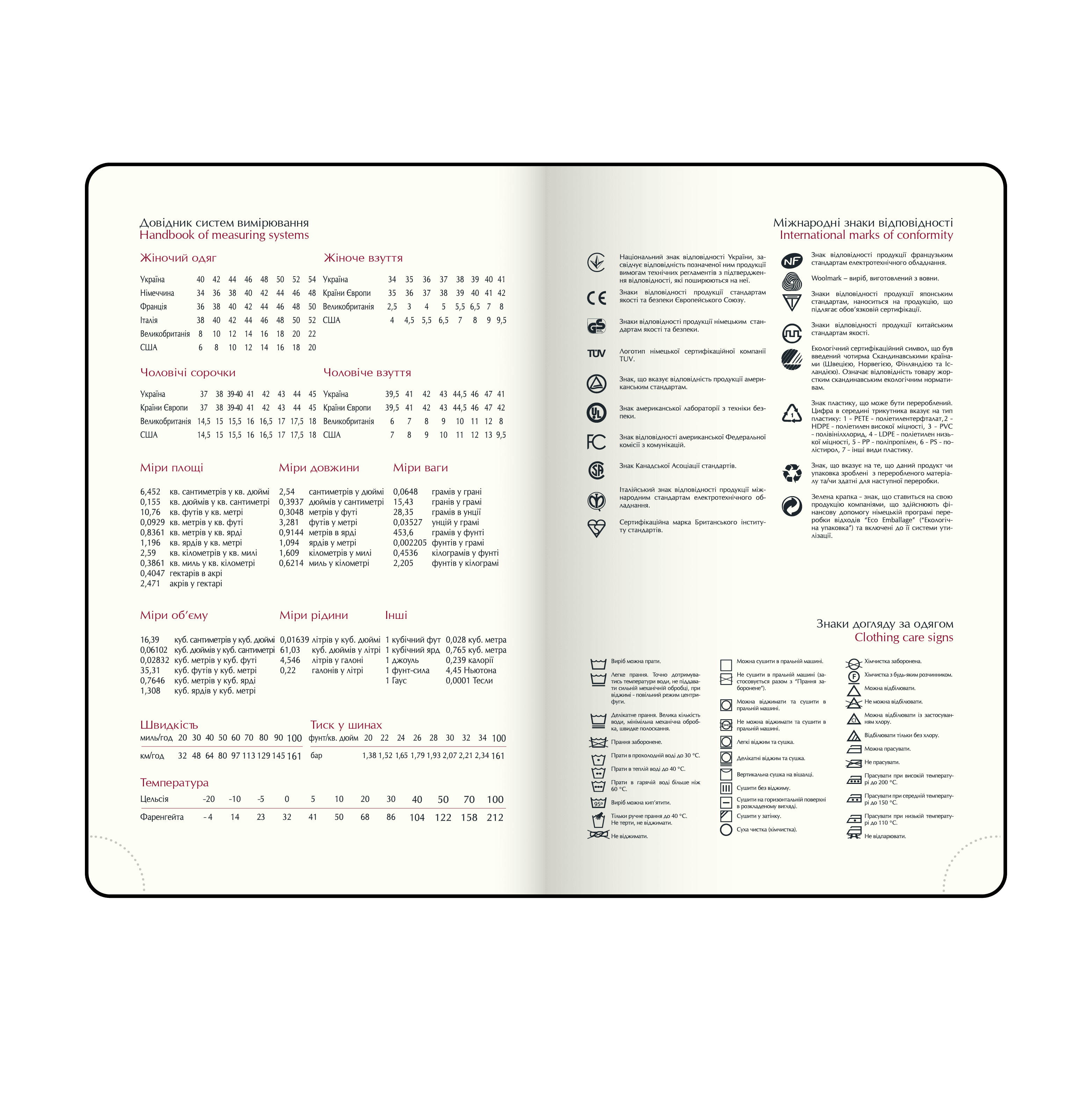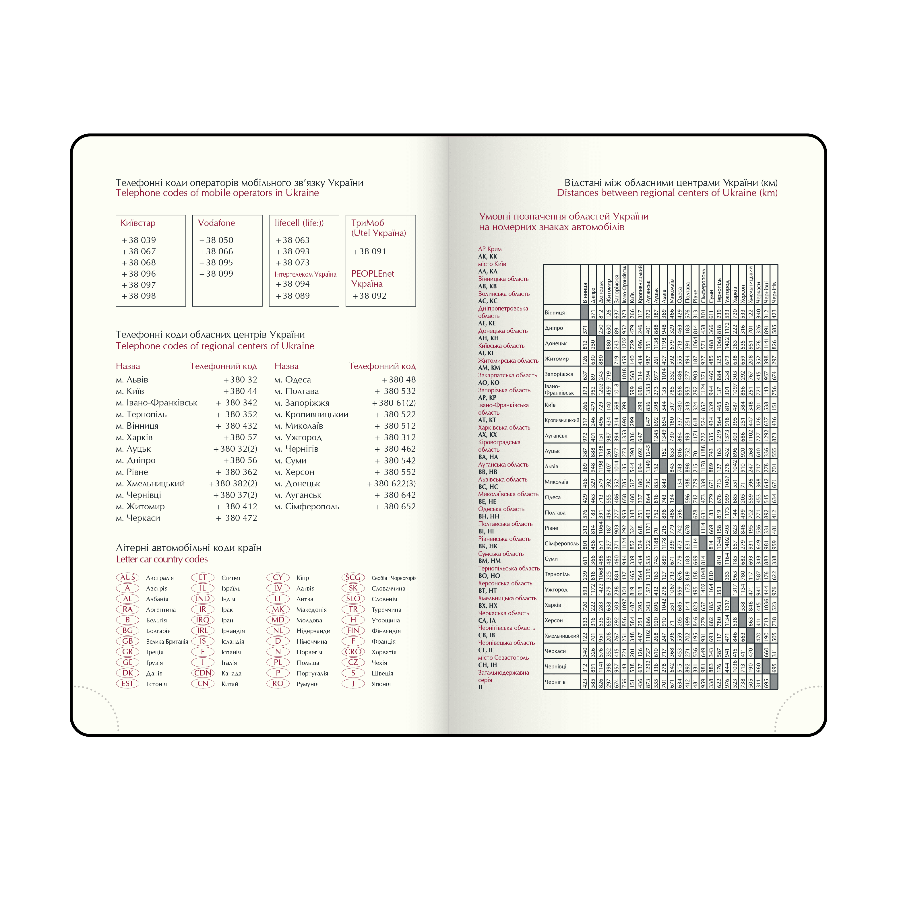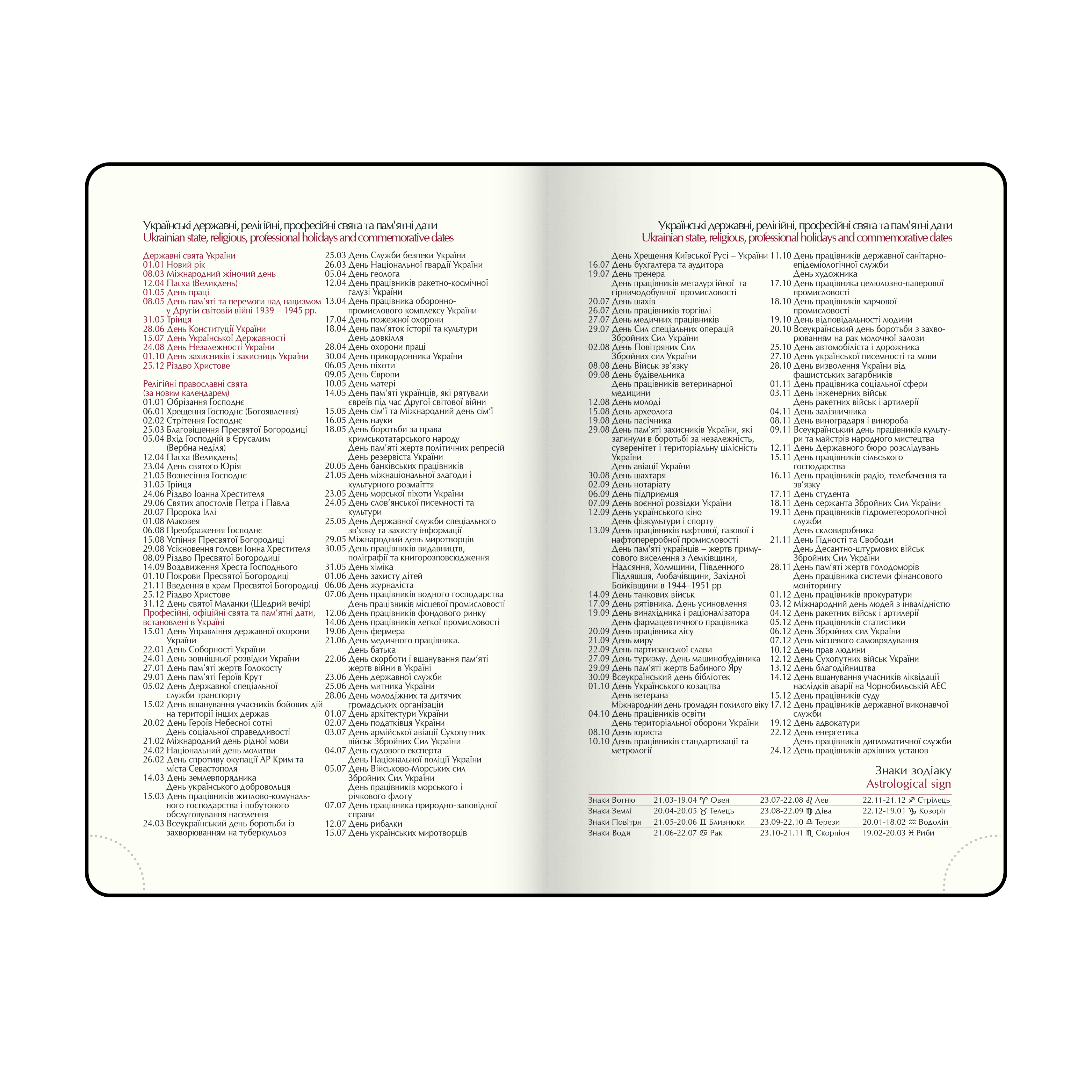 - Інформаційно-довідковий блок: національні, релігійні, професійні свята та пам'ятні дати, знаки зодіаку, телефонні коди мобільних операторів та обласних центрів України, літерні автомобільні коди країн, таблиця відстаней між обласними центрами України, довідник систем вимірювання, міжнародні знаки відповідності, знаки догляду за одягом