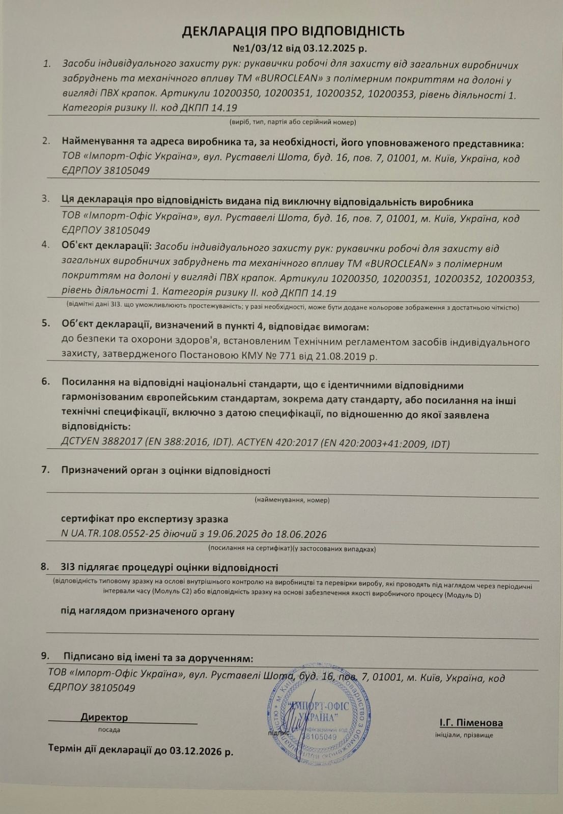Відповідає стандарту ДСТУ EN 388-2017 "Рукавички захисні для захисту від механічних ушкоджень"
