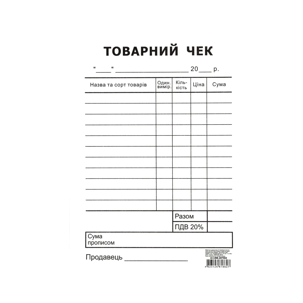 Формат А6Орієнтація бланка: вертикальнийВиготовлений на офсетному папері щільністю 60 г/м²ОдностороннійДрук в 1 колірБланки проклеєні по короткій стороні в блоки по 100 арк.